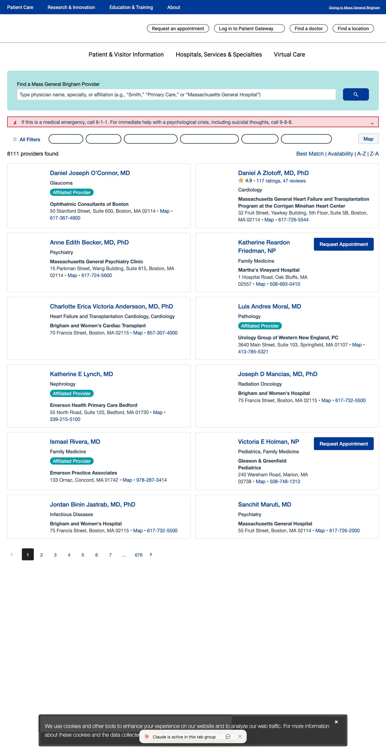 The Find a Doctor experience, powered by a dedicated subdomain, offers deep filtering by specialty, insurance, language, age group, and provider gender, with star ratings and patient review counts displayed inline — a level of transparency that reinforces the system’s patient-first positioning. Custom teal line-art iconography and bold statistics (2.5 million patients, 3,700+ clinical trials) give the homepage a confident editorial rhythm without overwhelming the visitor. The Services and Specialties page uses descriptive teal cards for institutes like Cancer, Heart and Vascular, Orthopedics, and the innovative Healthcare at Home program. A sweeping navy wave graphic anchors the footer, tying the design together with the same sense of institutional gravitas that Mass General Brigham commands in the real world.