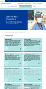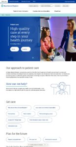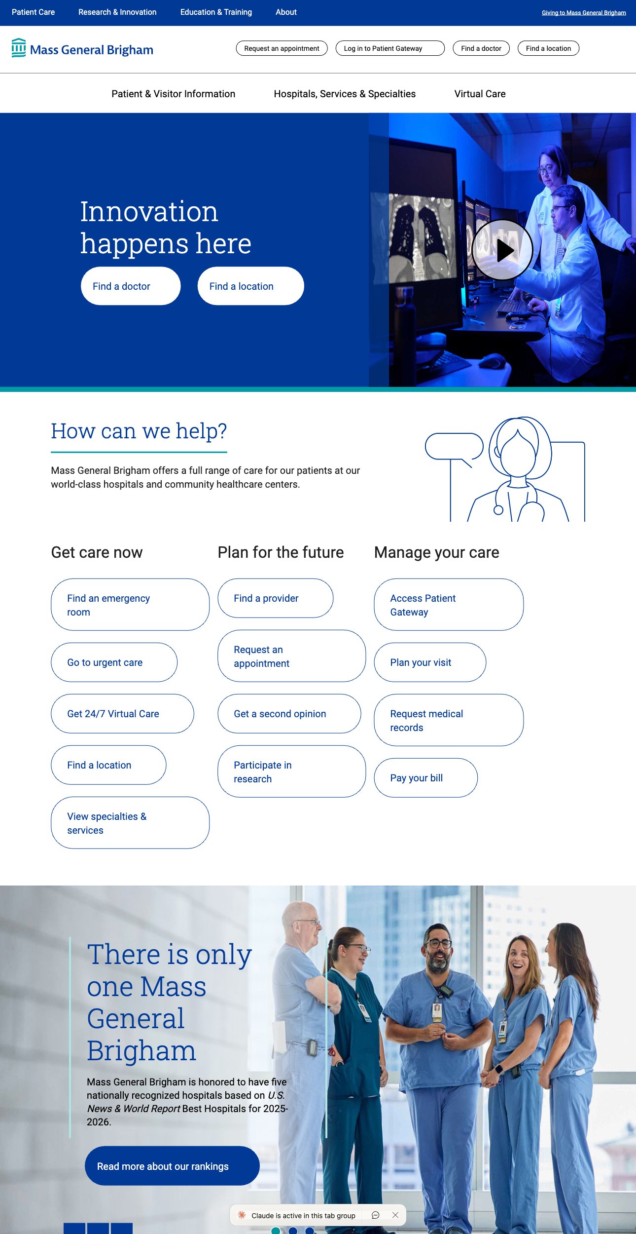 Mass General Brigham’s website carries the weight of one of the nation’s most prestigious academic health systems — and it delivers. Built on a deep navy and teal color palette that evokes trust and institutional authority, the site opens with a bold “Innovation happens here” hero featuring researchers reviewing brain imaging in a dramatically lit laboratory. The dual-layer navigation is smartly architected: a top bar for organizational pillars like Research & Innovation, Education & Training, and About, and a second tier for patient-facing tasks including Hospitals, Services & Specialties, and Virtual Care. A “How can we help?” section provides immediate utility through a well-organized grid of pill-shaped action buttons spanning three intent columns — Get care now, Plan for the future, and Manage your care — making wayfinding intuitive even within a system of this complexity.